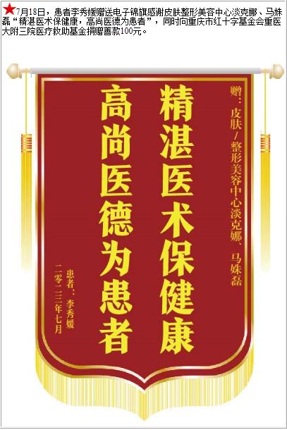 患者李秀媛赠送电子锦旗感谢皮肤整形美容中心淡克娜等人,并向医疗救助基金捐赠善款100元-锦旗-患者心声-患者服务-重庆医科大学附属第三医院【官方网站】