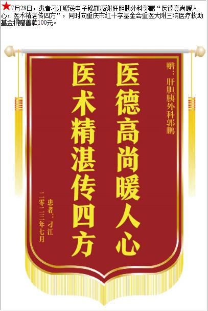 患者刁江赠送电子锦旗感谢肝胆胰外科郭鹏,并向医疗救助基金捐赠善款100元-锦旗-患者心声-患者服务-重庆医科大学附属第三医院【官方网站】