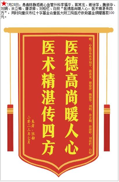 患者陈静感谢心血管外科李福平等人,并向医疗救助基金捐赠善款100元-锦旗-患者心声-患者服务-重庆医科大学附属第三医院【官方网站】
