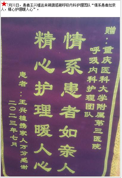患者王兴植送来锦旗感谢呼吸内科护理团队“情系患者如亲人,精心护理暖人心”-锦旗-患者心声-患者服务-重庆医科大学附属第三医院【官方网站】