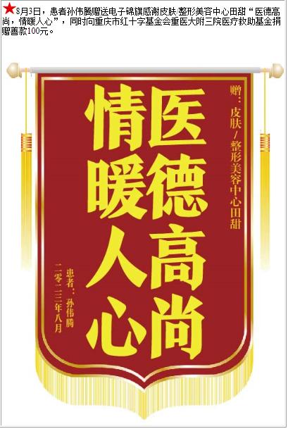 患者孙伟腾赠送电子锦旗感谢皮肤/整形美容中心田甜,并向医疗救助基金捐赠善款100元-锦旗-患者心声-患者服务-重庆医科大学附属第三医院【官方网站】