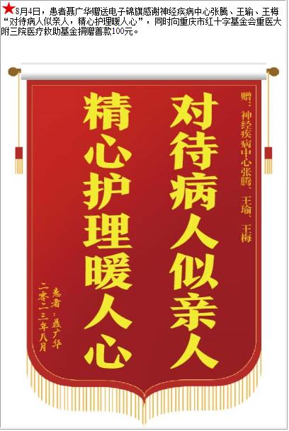 患者聂广华赠送电子锦旗感谢神经疾病中心张腾等人,并向医疗救助基金捐赠善款100元-锦旗-患者心声-患者服务-重庆医科大学附属第三医院【官方网站】