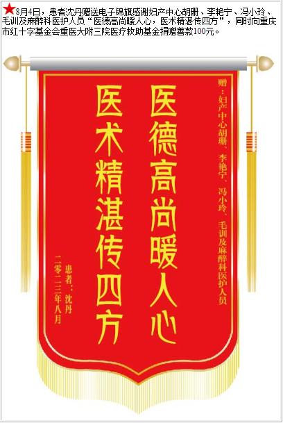 患者沈丹赠送电子锦旗感谢妇产中心胡珊等人及麻醉科医护人员,并向医疗救助基金捐赠善款100元-锦旗-患者心声-患者服务-重庆医科大学附属第三医院【官方网站】