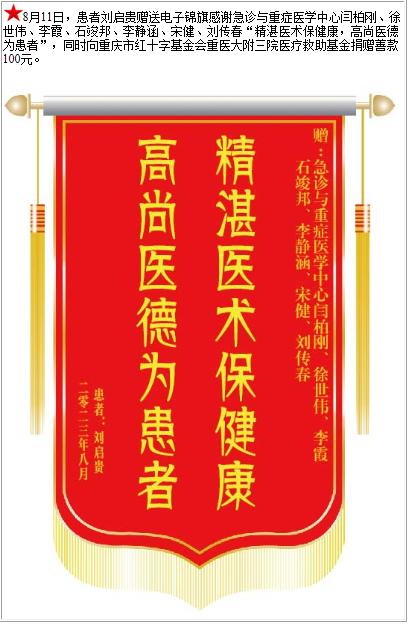 患者刘启贵赠送电子锦旗感谢急诊与重症医学中心闫柏刚等人,并向医疗救助基金捐赠善款100元-锦旗-患者心声-患者服务-重庆医科大学附属第三医院【官方网站】