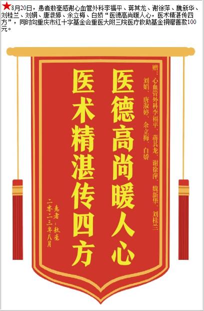 患者敖毫赠送电子锦旗感谢心血管外科李福平等人,并向医疗救助基金捐赠善款100元-锦旗-患者心声-患者服务-重庆医科大学附属第三医院【官方网站】