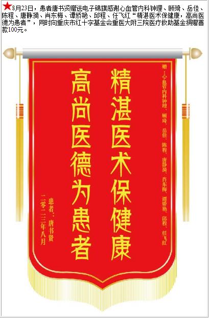 患者唐书贤赠送电子锦旗感谢心血管内科钟理等人,并向医疗救助基金捐赠善款100元-锦旗-患者心声-患者服务-重庆医科大学附属第三医院【官方网站】