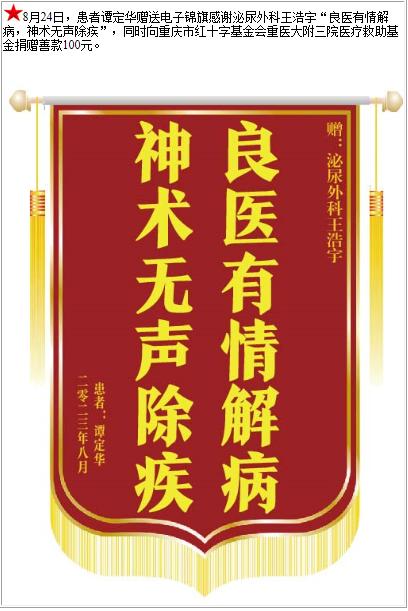 患者谭定华赠送电子锦旗感谢泌尿外科王浩宇,并向医疗救助基金捐赠善款100元-锦旗-患者心声-患者服务-重庆医科大学附属第三医院【官方网站】