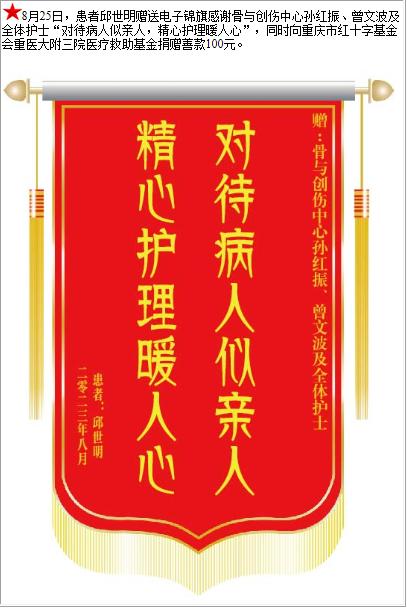 患者邱世明赠送电子锦旗感谢骨与创伤中心孙红振等人及全体护士,并向医疗救助基金捐赠善款100元-锦旗-患者心声-患者服务-重庆医科大学附属第三医院【官方网站】