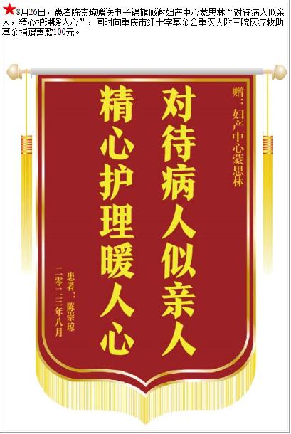患者陈崇琼赠送电子锦旗感谢妇产中心蒙思林,并向医疗救助基金捐赠善款100元-锦旗-患者心声-患者服务-重庆医科大学附属第三医院【官方网站】