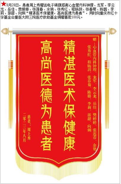 患者周上秀赠送电子锦旗感谢心血管内科钟理等人,并向医疗救助基金捐赠善款100元-锦旗-患者心声-患者服务-重庆医科大学附属第三医院【官方网站】