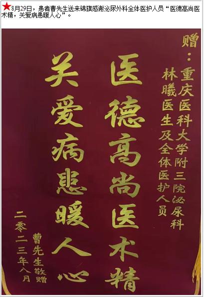 患者曹先生送来锦旗感谢泌尿外科全体医护人员“医德高尚医术精,关爱病患暖人心”-锦旗-患者心声-患者服务-重庆医科大学附属第三医院【官方网站】