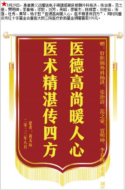 患者黄义远赠送电子锦旗感谢肝胆胰外科杨洪等人,并向医疗救助基金捐赠善款100元-锦旗-患者心声-患者服务-重庆医科大学附属第三医院【官方网站】