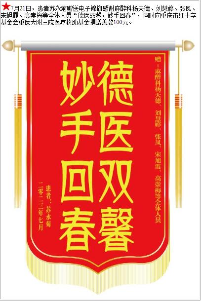 患者苏永菊赠送电子锦旗感谢麻醉科杨天德等人及全体人员,并向医疗救助基金捐赠善款100元-锦旗-患者心声-患者服务-重庆医科大学附属第三医院【官方网站】