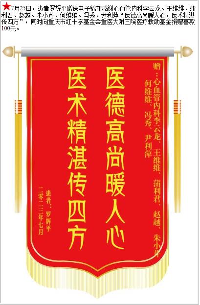 患者罗辉平赠送电子锦旗感谢心血管内科李云龙等人,并向医疗救助基金捐赠善款100元-锦旗-患者心声-患者服务-重庆医科大学附属第三医院【官方网站】