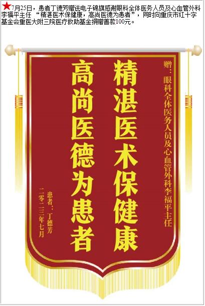 患者丁德芳赠送电子锦旗感谢眼科全体医务人员及心血管外科李福平主任 ,并向医疗救助基金捐赠善款100元-锦旗-患者心声-患者服务-重庆医科大学附属第三医院【官方网站】