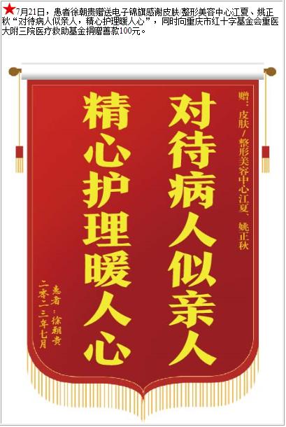 患者徐朝贵赠送电子锦旗感谢皮肤/整形美容中心江夏等人,并向医疗救助基金捐赠善款100元-锦旗-患者心声-患者服务-重庆医科大学附属第三医院【官方网站】