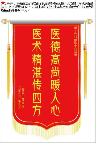 患者傅家宝赠送电子锦旗感谢骨与创伤中心郑明,并向医疗救助基金捐赠善款100元-锦旗-患者心声-患者服务-重庆医科大学附属第三医院【官方网站】