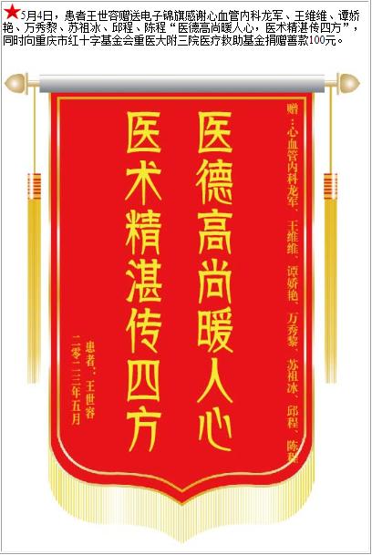 患者王世容赠送电子锦旗感谢心血管内科龙军等人,并向医疗救助基金捐赠善款100元-锦旗-患者心声-患者服务-重庆医科大学附属第三医院【官方网站】
