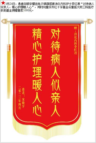 患者宋晓宇赠送电子锦旗感谢消化内科护士李红君,并向医疗救助基金捐赠善款1000元-锦旗-患者心声-患者服务-重庆医科大学附属第三医院【官方网站】