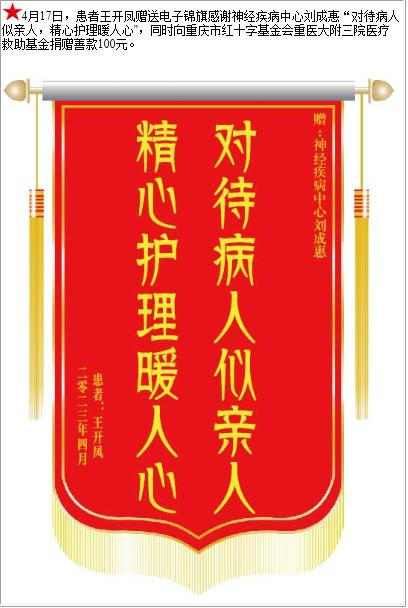患者王开凤赠送电子锦旗感谢神经疾病中心刘成惠,并向医疗救助基金捐赠善款100元-锦旗-患者心声-患者服务-重庆医科大学附属第三医院【官方网站】