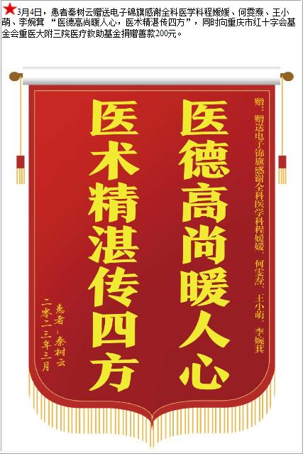患者秦树云赠送电子锦旗感谢全科医学科程嫒媛等人,并向医疗救助基金捐赠善款200元-锦旗-患者心声-患者服务-重庆医科大学附属第三医院【官方网站】