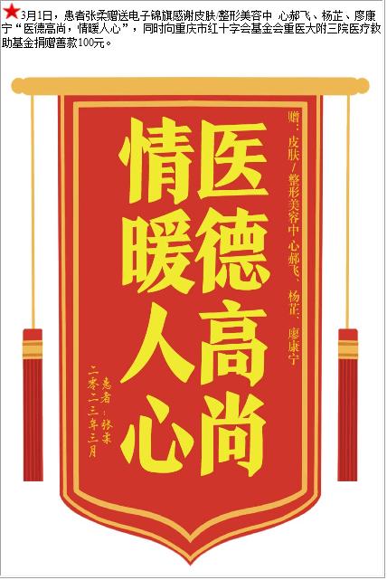 患者张柔赠送电子锦旗感谢皮肤/整形美容中心郝飞等人,并向医疗救助基金捐赠善款100元-锦旗-患者心声-患者服务-重庆医科大学附属第三医院【官方网站】
