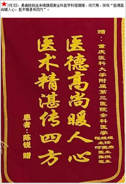 患者陈锐送来锦旗感谢全科医学科程媛媛等人“医德高尚暖人心,医术精湛传四方”-锦旗-患者心声-患者服务-重庆医科大学附属第三医院【官方网站】