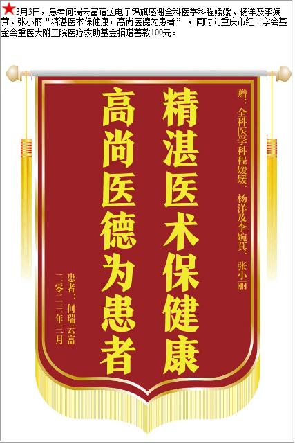 患者何瑞云富赠送电子锦旗感谢全科医学科程媛媛等人,并向医疗救助基金捐赠善款100元-锦旗-患者心声-患者服务-重庆医科大学附属第三医院【官方网站】