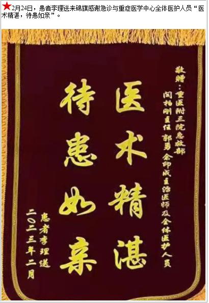 患者李理送来锦旗感谢急诊与重症医学中心全体医护人员“医术精湛,待患如亲”-锦旗-患者心声-患者服务-重庆医科大学附属第三医院【官方网站】