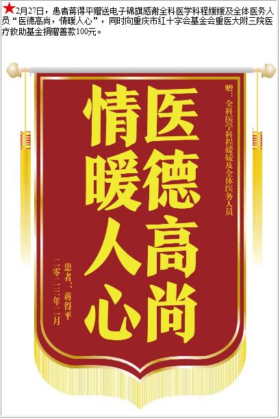 患者蒋得平赠送电子锦旗感谢全科医学科程媛媛及全体医务人员,并向医疗救助基金捐赠善款100元-锦旗-患者心声-患者服务-重庆医科大学附属第三医院【官方网站】