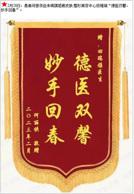 患者何丽侠送来锦旗感谢皮肤/整形美容中心田雅瑞“德医双馨,妙手回春”