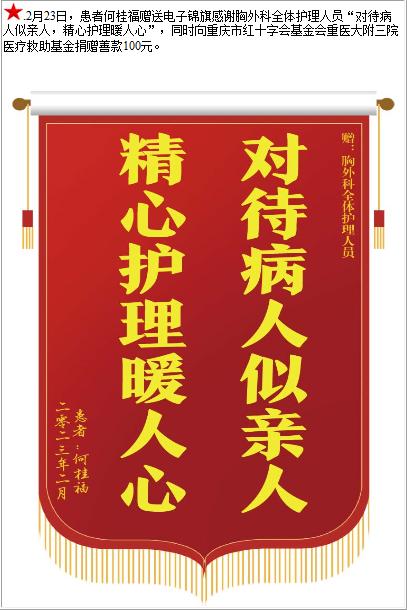 患者何桂福赠送电子锦旗感谢胸外科全体护理人员,并向医疗救助基金捐赠善款100元-锦旗-患者心声-患者服务-重庆医科大学附属第三医院【官方网站】