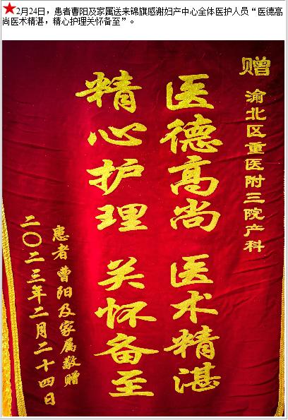 患者曹阳及家属送来锦旗感谢妇产中心全体医护人员“医德高尚医术精湛,精心护理关怀备至”-锦旗-患者心声-患者服务-重庆医科大学附属第三医院【官方网站】