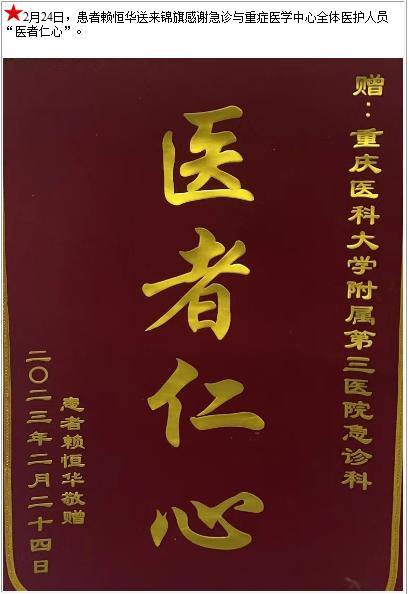 患者赖恒华送来锦旗感谢急诊与重症医学中心全体医护人员“医者仁心”-锦旗-患者心声-患者服务-重庆医科大学附属第三医院【官方网站】