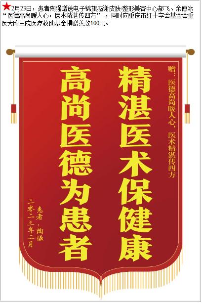 患者陶强赠送电子锦旗感谢皮肤/整形美容中心郝飞等人,并向医疗救助基金捐赠善款100元-锦旗-患者心声-患者服务-重庆医科大学附属第三医院【官方网站】
