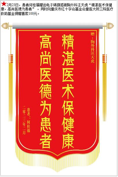 患者何桂福赠送电子锦旗感谢胸外科汪天虎,并向医疗救助基金捐赠善款100元-锦旗-患者心声-患者服务-重庆医科大学附属第三医院【官方网站】