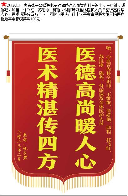 患者张子碧赠送电子锦旗感谢心血管内科仝识非等人及全体医护人员,并向医疗救助基金捐赠善款100元-锦旗-患者心声-患者服务-重庆医科大学附属第三医院【官方网站】