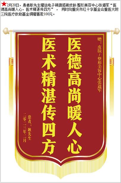 患者耿先生赠送电子锦旗感谢皮肤/整形美容中心张道军,并向医疗救助基金捐赠善款100元-锦旗-患者心声-患者服务-重庆医科大学附属第三医院【官方网站】