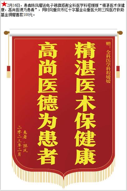 患者陈凤赠送电子锦旗感谢全科医学科程媛媛,并向医疗救助基金捐赠善款100元-锦旗-患者心声-患者服务-重庆医科大学附属第三医院【官方网站】