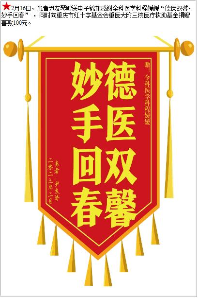 患者尹友琴赠送电子锦旗感谢全科医学科程媛媛,并向医疗救助基金捐赠善款100元-锦旗-患者心声-患者服务-重庆医科大学附属第三医院【官方网站】