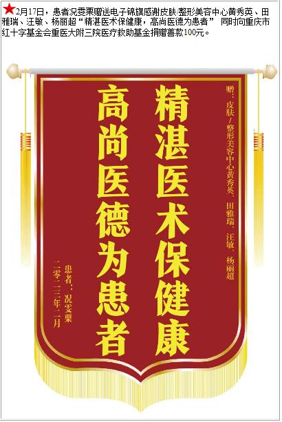 患者况雯栗赠送电子锦旗感谢皮肤/整形美容中心黄秀英等人 ,并向医疗救助基金捐赠善款100元-锦旗-患者心声-患者服务-重庆医科大学附属第三医院【官方网站】