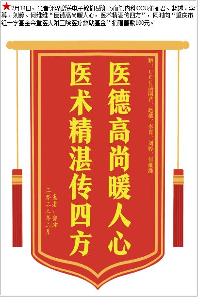 患者郭隆赠送电子锦旗感谢心血管内科CCU蒲丽君等人,并向医疗救助基金捐赠善款100元-锦旗-患者心声-患者服务-重庆医科大学附属第三医院【官方网站】