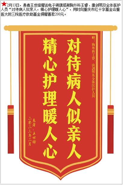患者王世锋赠送电子锦旗感谢胸外科王睿等人及全体医护人员,并向医疗救助基金捐赠善款200元-锦旗-患者心声-患者服务-重庆医科大学附属第三医院【官方网站】