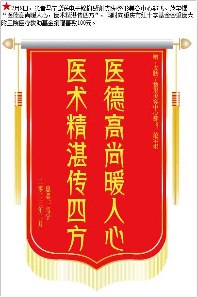 患者马宁赠送电子锦旗感谢皮肤/整形美容中心郝飞等人,并向医疗救助基金捐赠善款100元-锦旗-患者心声-患者服务-重庆医科大学附属第三医院【官方网站】