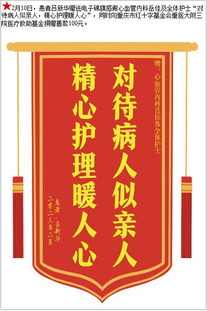 患者吕新华赠送电子锦旗感谢心血管内科岳佳及全体护士,并向医疗救助基金捐赠善款100元-锦旗-患者心声-患者服务-重庆医科大学附属第三医院【官方网站】