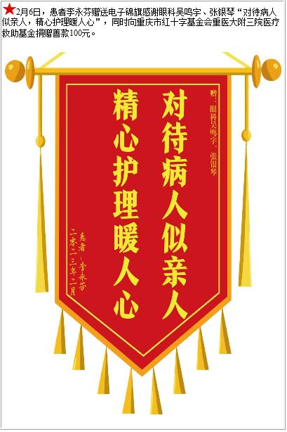 患者李永芬赠送电子锦旗感谢眼科吴鸣宇等人,并向医疗救助基金捐赠善款100元-锦旗-患者心声-患者服务-重庆医科大学附属第三医院【官方网站】