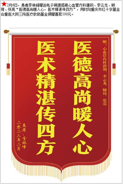 患者李林峰赠送电子锦旗感谢心血管内科唐钢等人,并向医疗救助基金捐赠善款100元-锦旗-患者心声-患者服务-重庆医科大学附属第三医院【官方网站】