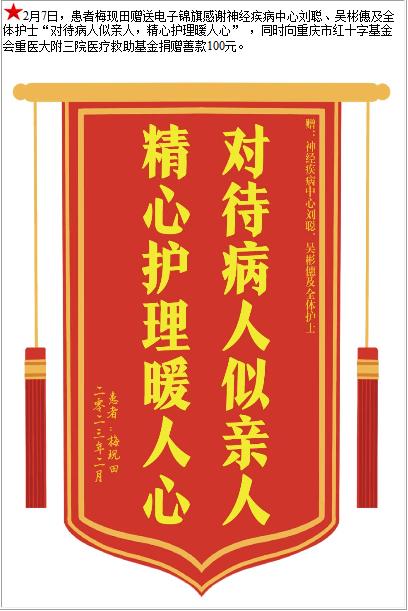 患者梅现田赠送电子锦旗感谢神经疾病中心刘聪等人及全体护士,并向医疗救助基金捐赠善款100元-锦旗-患者心声-患者服务-重庆医科大学附属第三医院【官方网站】