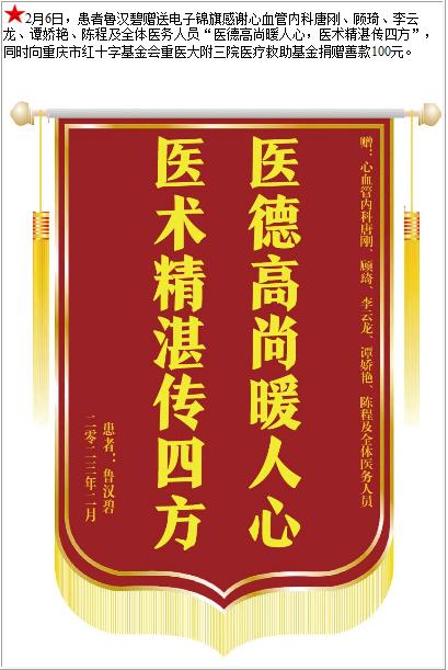 患者鲁汉碧赠送电子锦旗感谢心血管内科唐刚等人及全体医务人员,并向医疗救助基金捐赠善款100元-锦旗-患者心声-患者服务-重庆医科大学附属第三医院【官方网站】