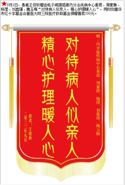患者王俊秋赠送电子锦旗感谢内分泌疾病中心秦思等人,并向医疗救助基金捐赠善款100元-锦旗-患者心声-患者服务-重庆医科大学附属第三医院【官方网站】
